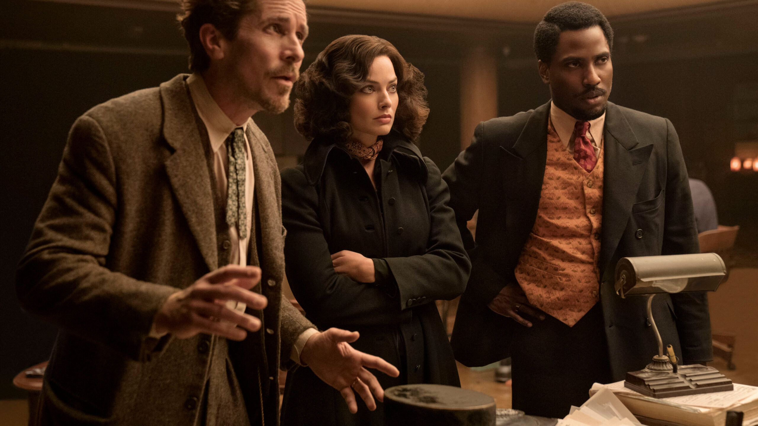 Burt (Christian Bale) and Harold (John David Washington) met as American soldiers in WWI, and stay in Europe after the war, sharing an Amsterdam apartment and a bohemian lifestyle with another spirited American expat, Valerie (Margot Robbie). As Amsterdam the movie opens, Burt, now a shady physician, and Harold, now a lawyer, have returned to New York City, and the two share a commitment to helping other WWI veterans. The two are called to investigate a suspicious death, which they determine to have been a murder, and then there’s another murder, for which they are framed. Off they go to find the real murderers and clear themselves, becoming entangled in a convoluted conspiracy and re-encountering Valerie in the process.